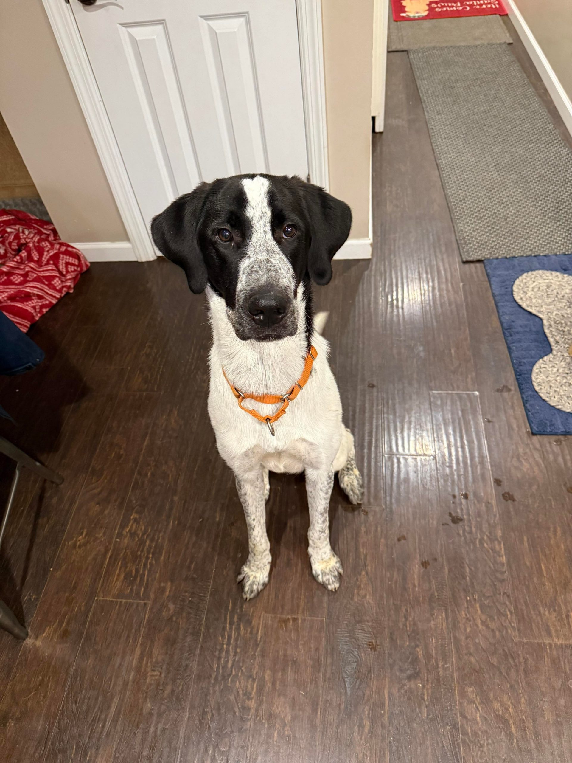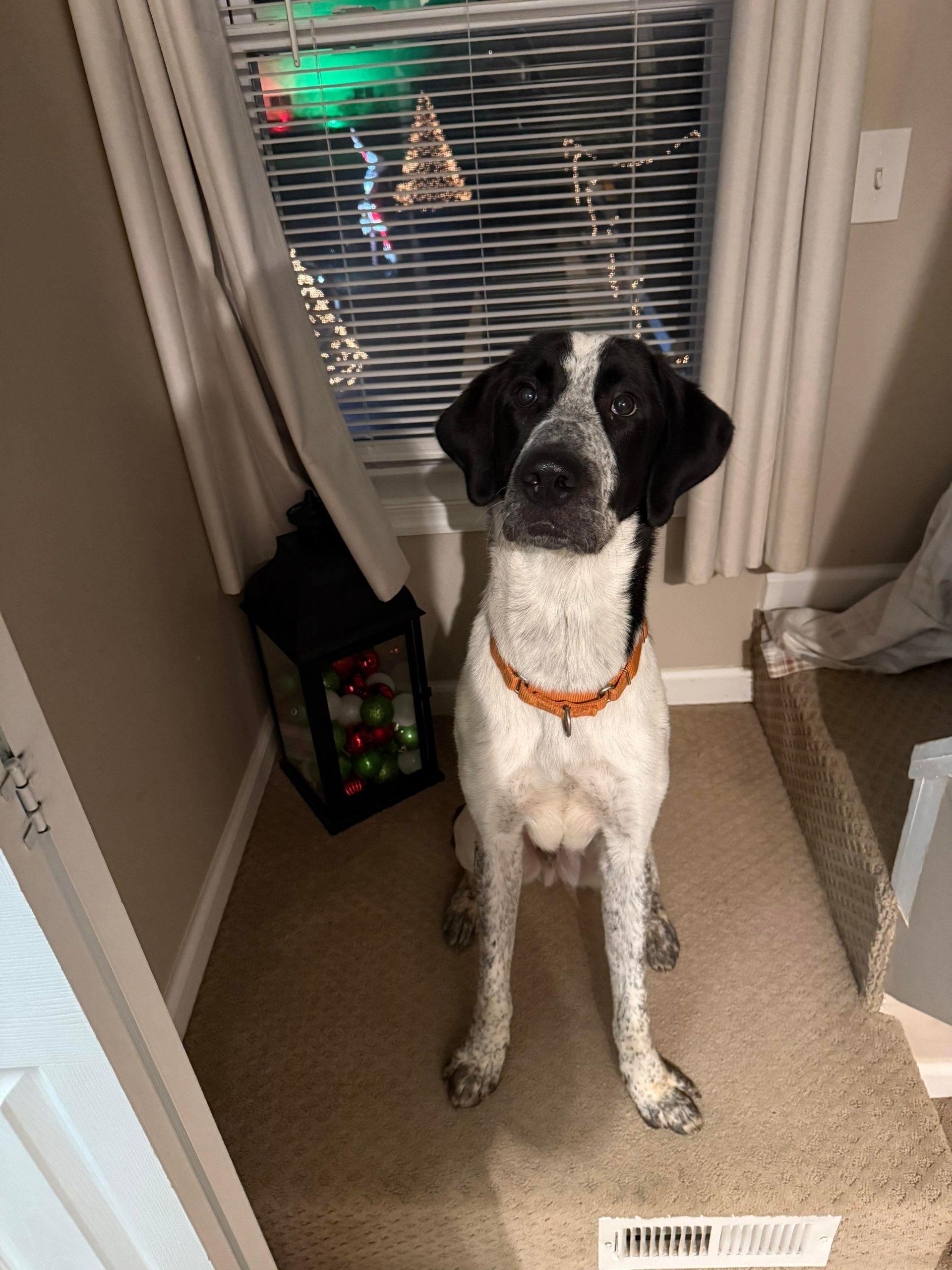 Clinton is a handsome hound, possibly Great Dane mix, with long legs and a gentle, soulful presence. Currently around 70 pounds (and still needing to put on a bit of weight), he’s a tall, lengthy guy who turns heads wherever he goes. Clinton spent most of his young life in a shelter, arriving there at just five months old, and we knew he deserved a chance at something more.