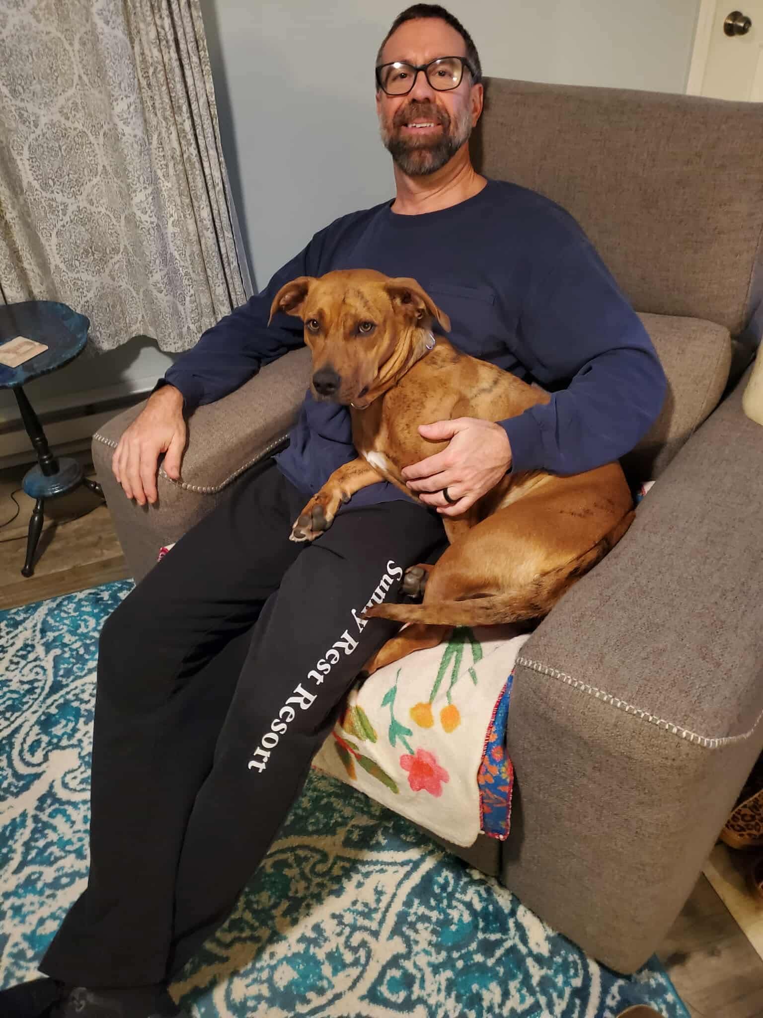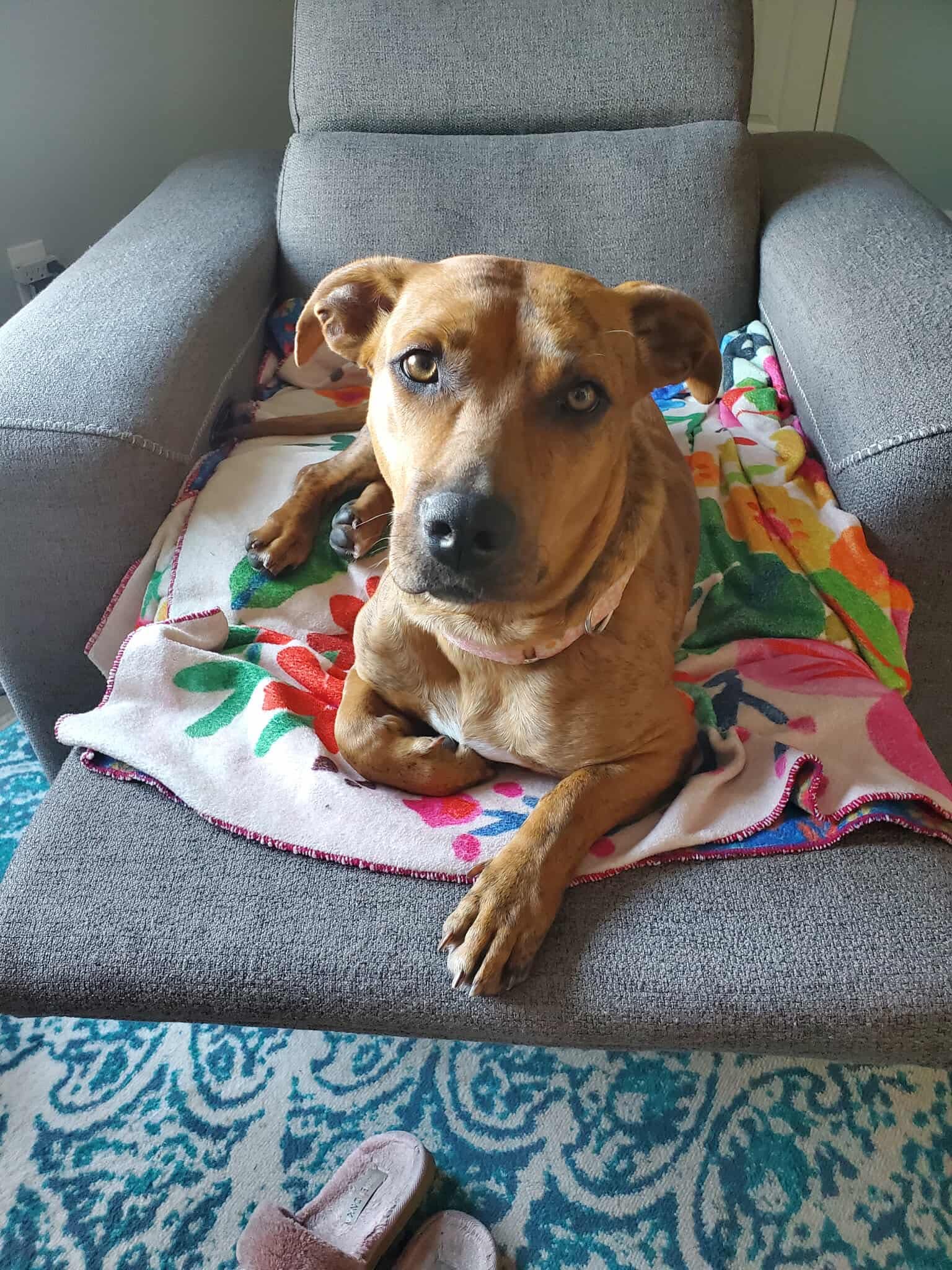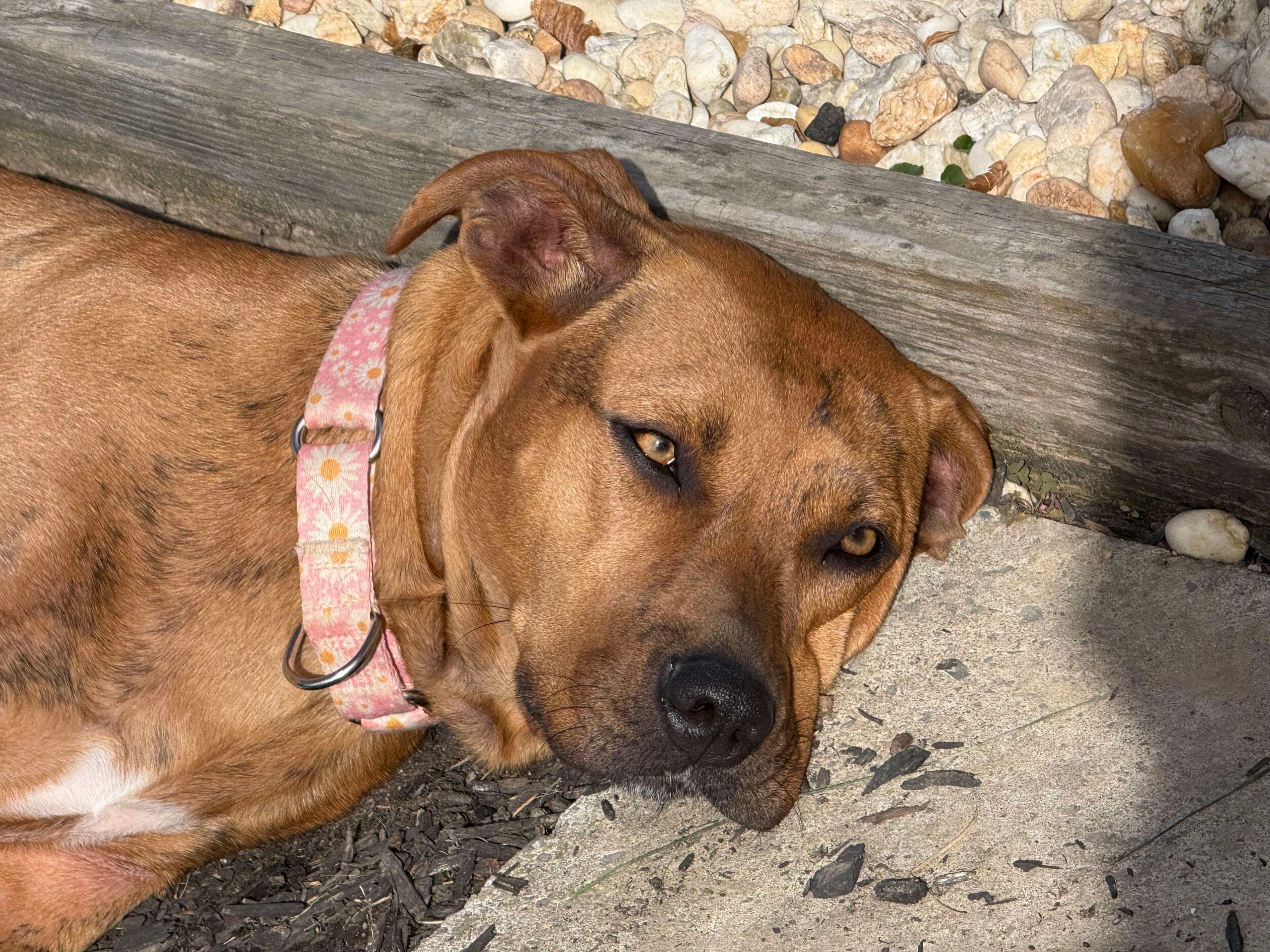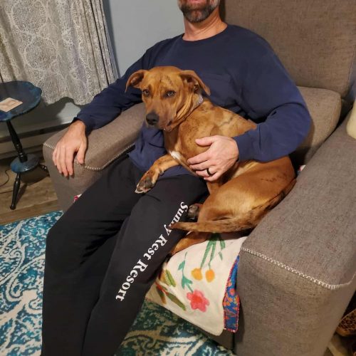 Originally from South Carolina, Della gave birth while at the shelter and has since made her way north in search of a brighter future. She is incredibly sweet-natured and mild-mannered, with a gentle soul that wins hearts wherever she goes. Della is dog-friendly, kid friendly and enjoys the company of other pups. She has not yet been tested with cats. But would likely do fine as she doesn’t mind chickens.