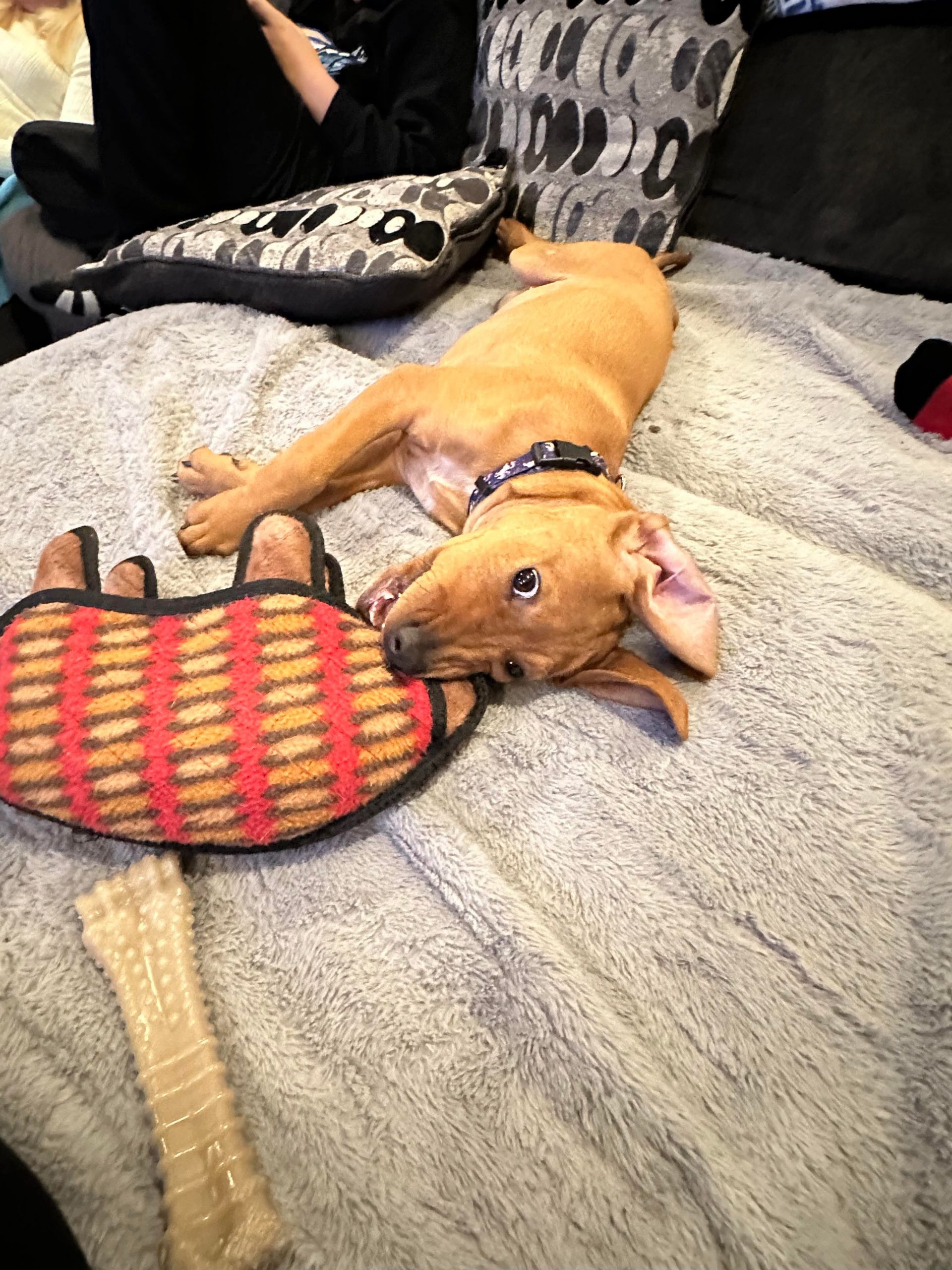 At just around 12 weeks old, Faye is your typical happy, playful puppy who is learning about the big world around her. Faye is potty trained and crate trained and will continue getting lots of love, structure, and socialization to help her grow into well-rounded dog.