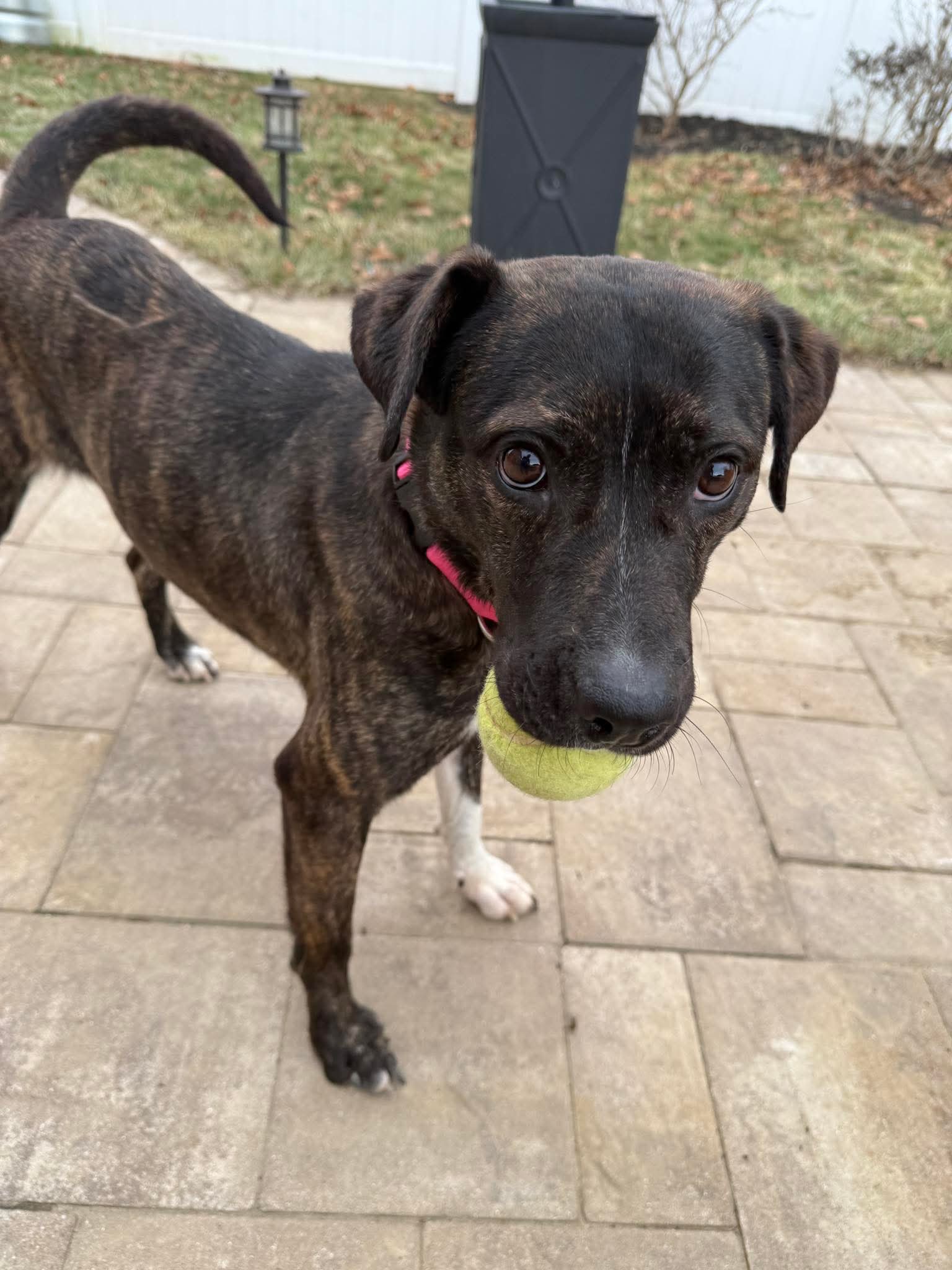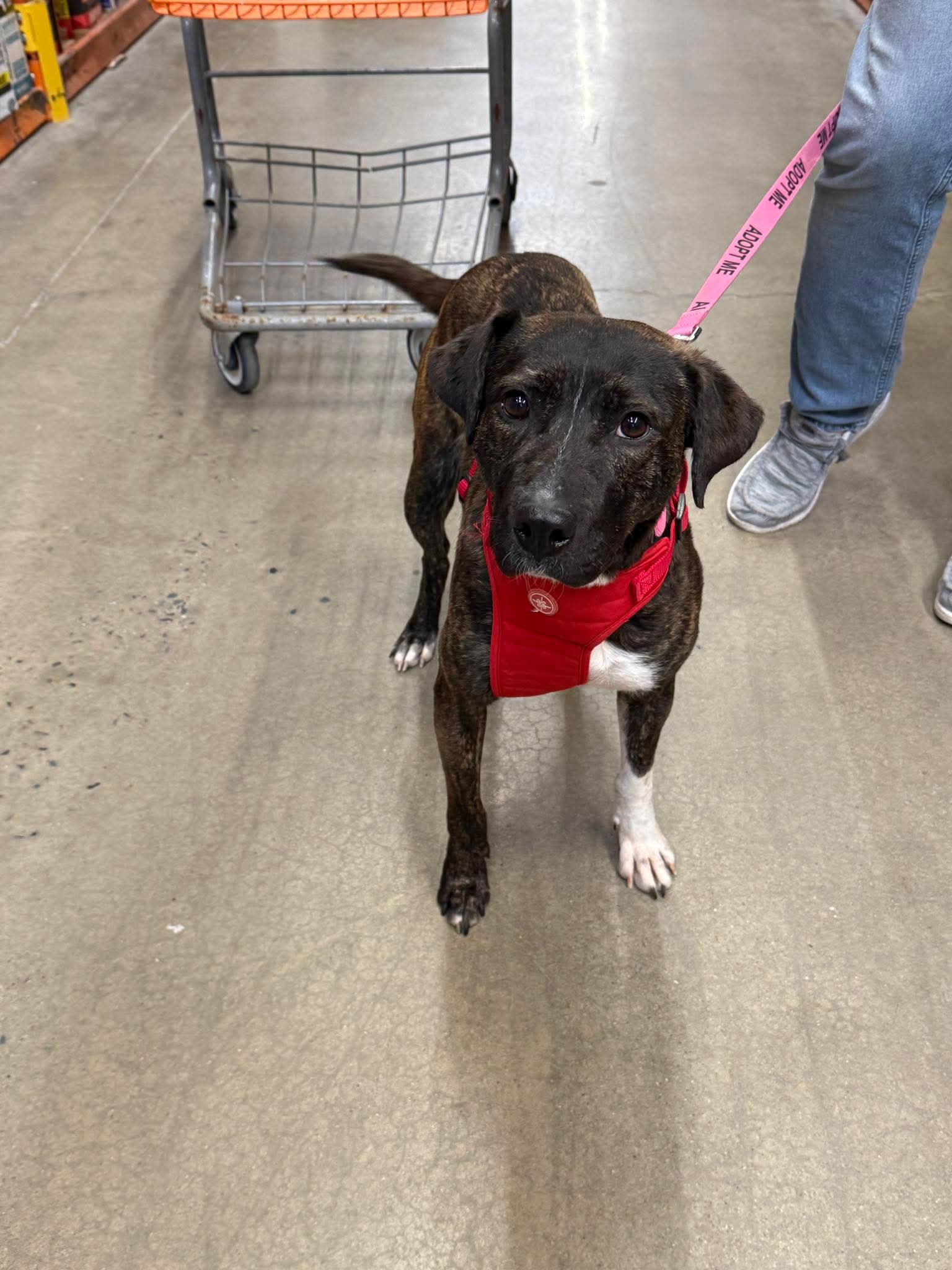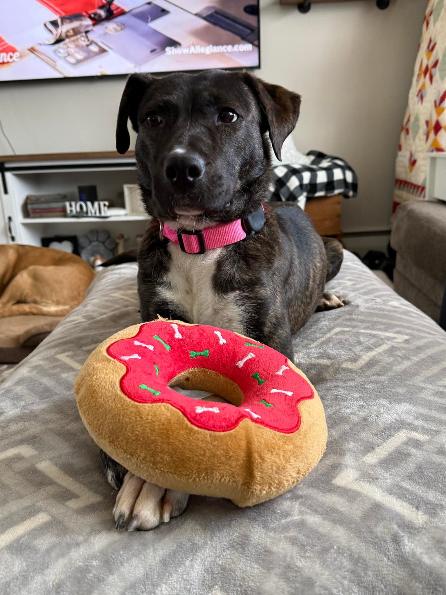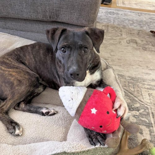 Sable is a beautiful 2-year-old Pitbull/Hound mix with a heart just as sweet as her soulful eyes. This lovely girl has a gentle, easygoing personality and a playful side that really shines—especially when toys are involved! If there’s a toy nearby, you can bet Sable will happily entertain herself or invite you to join in the fun.